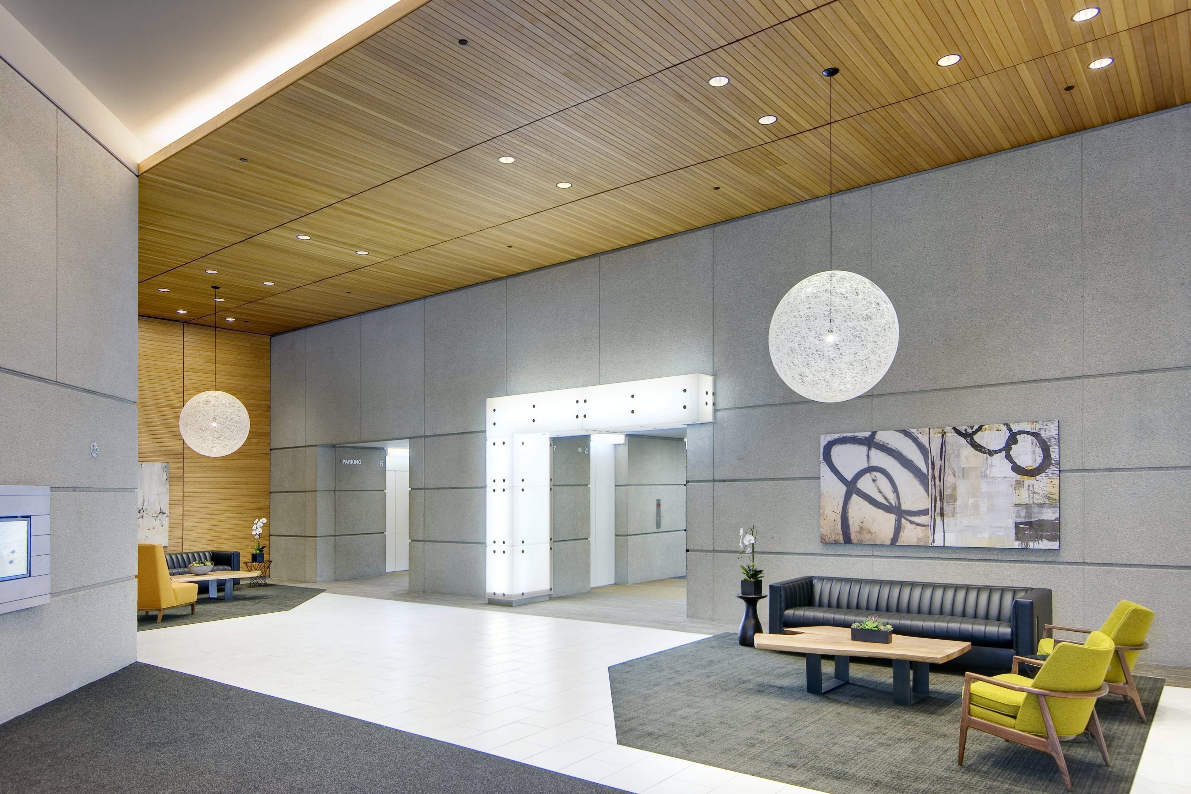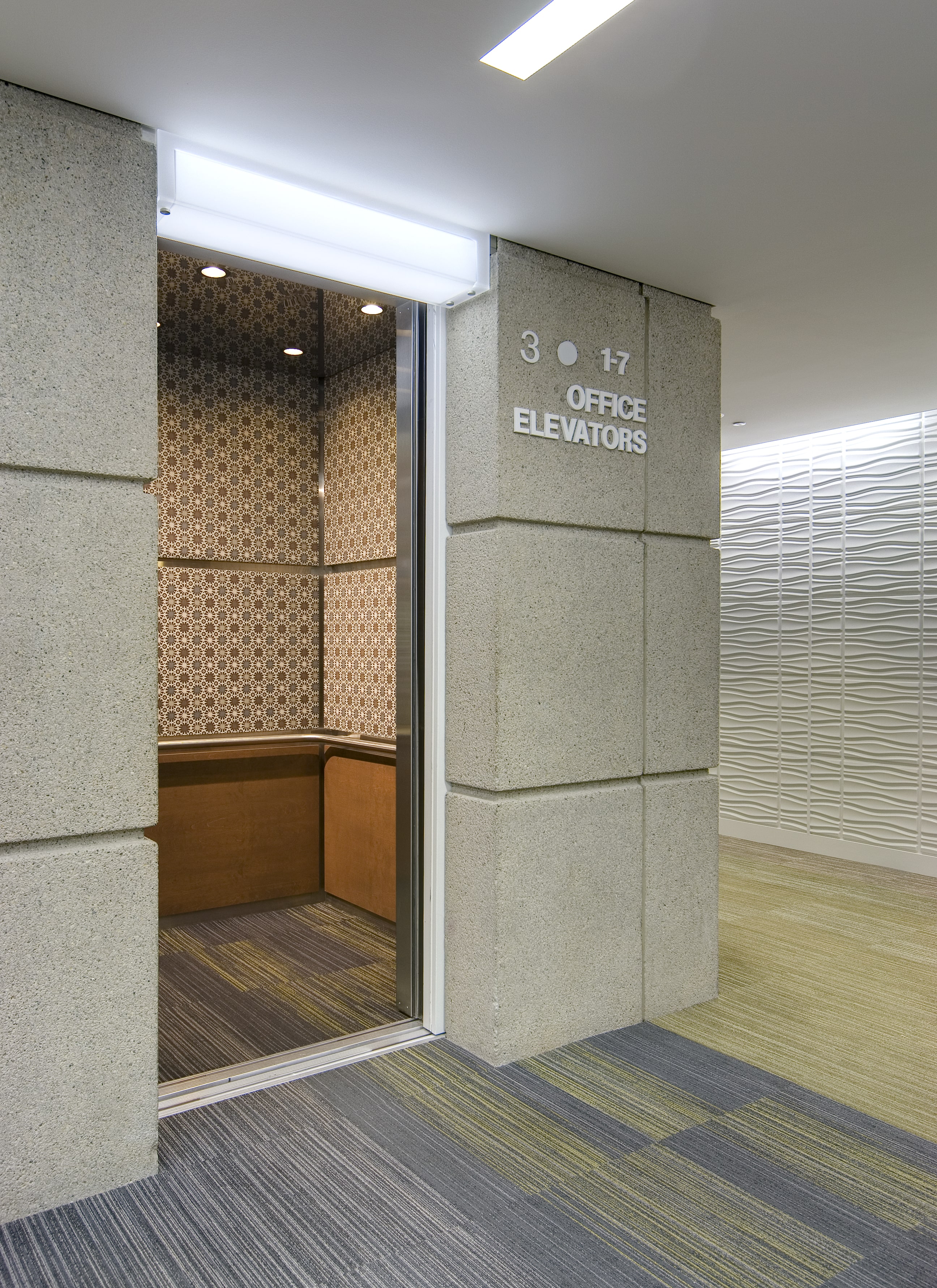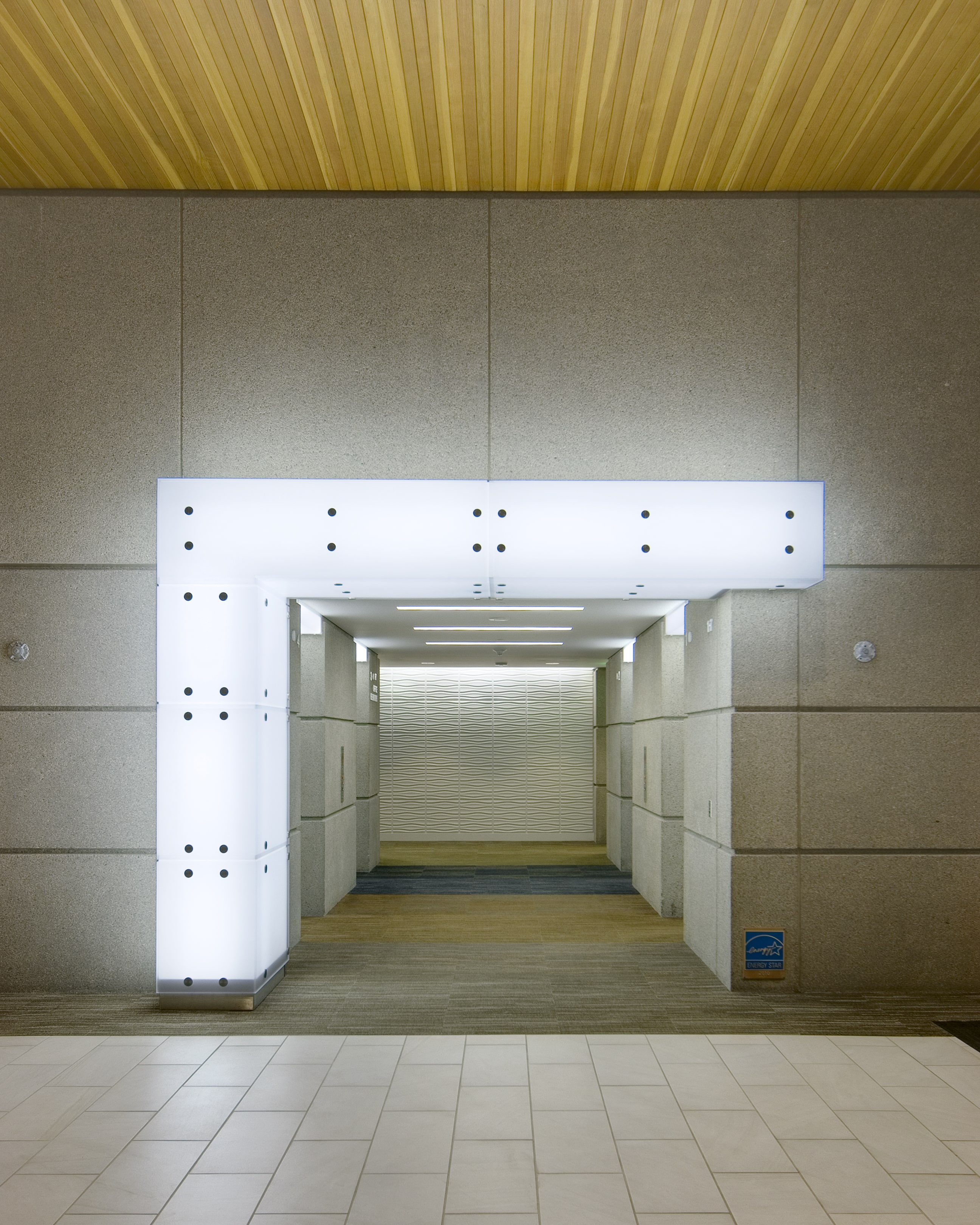 The buildings Entry walls are raised aggregate concrete. Modern and amazing. By significantly increasing the light levels and adding directional elements, the Entry space felts new and inviting.