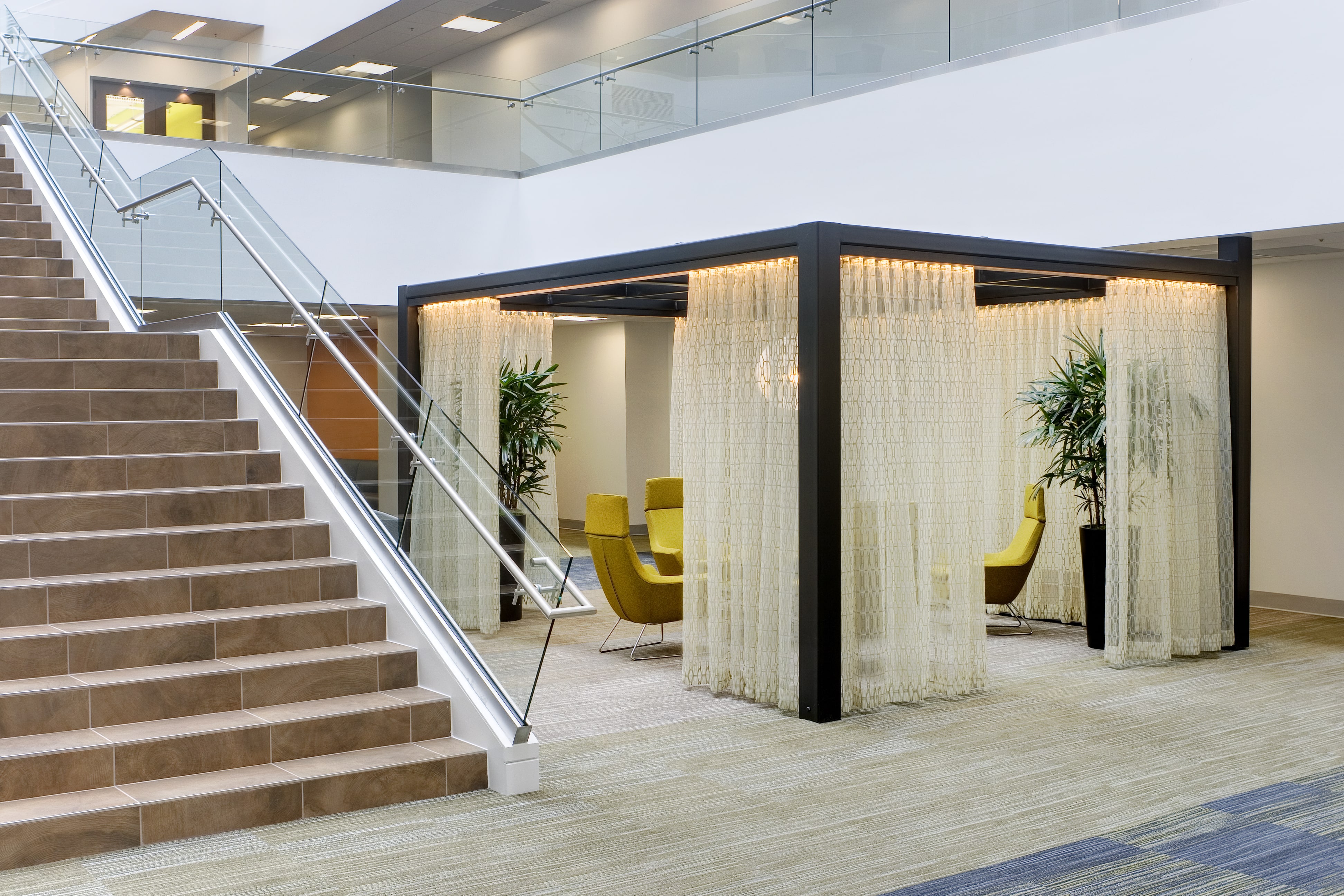 The introduction of a grand staircase was the heart of this transformation as it not only added a sculptural element to the space but a desperately needed means to move between the different floors of the Atrium. As with the meeting pods, it also activated the space physically and mentally.