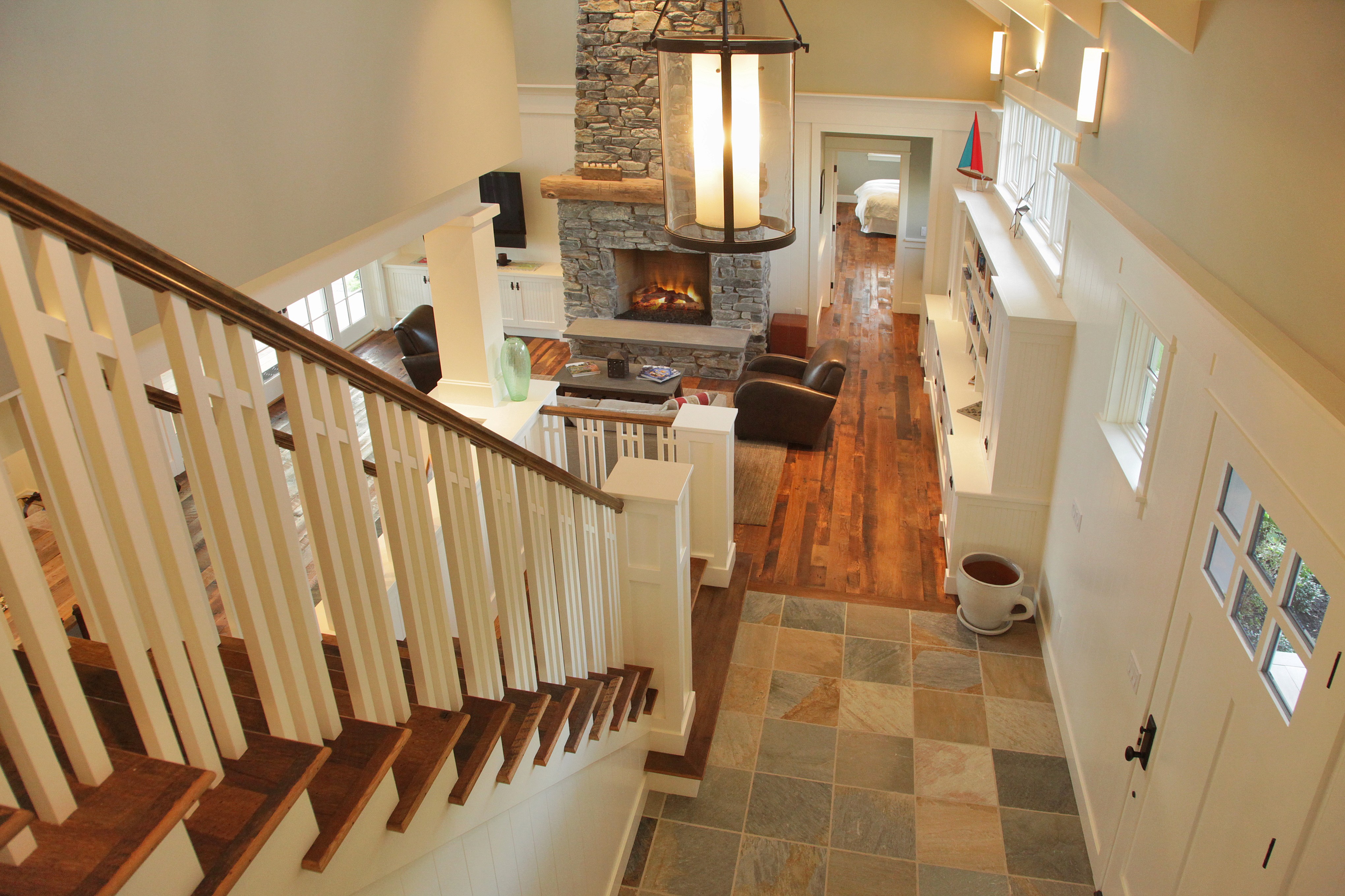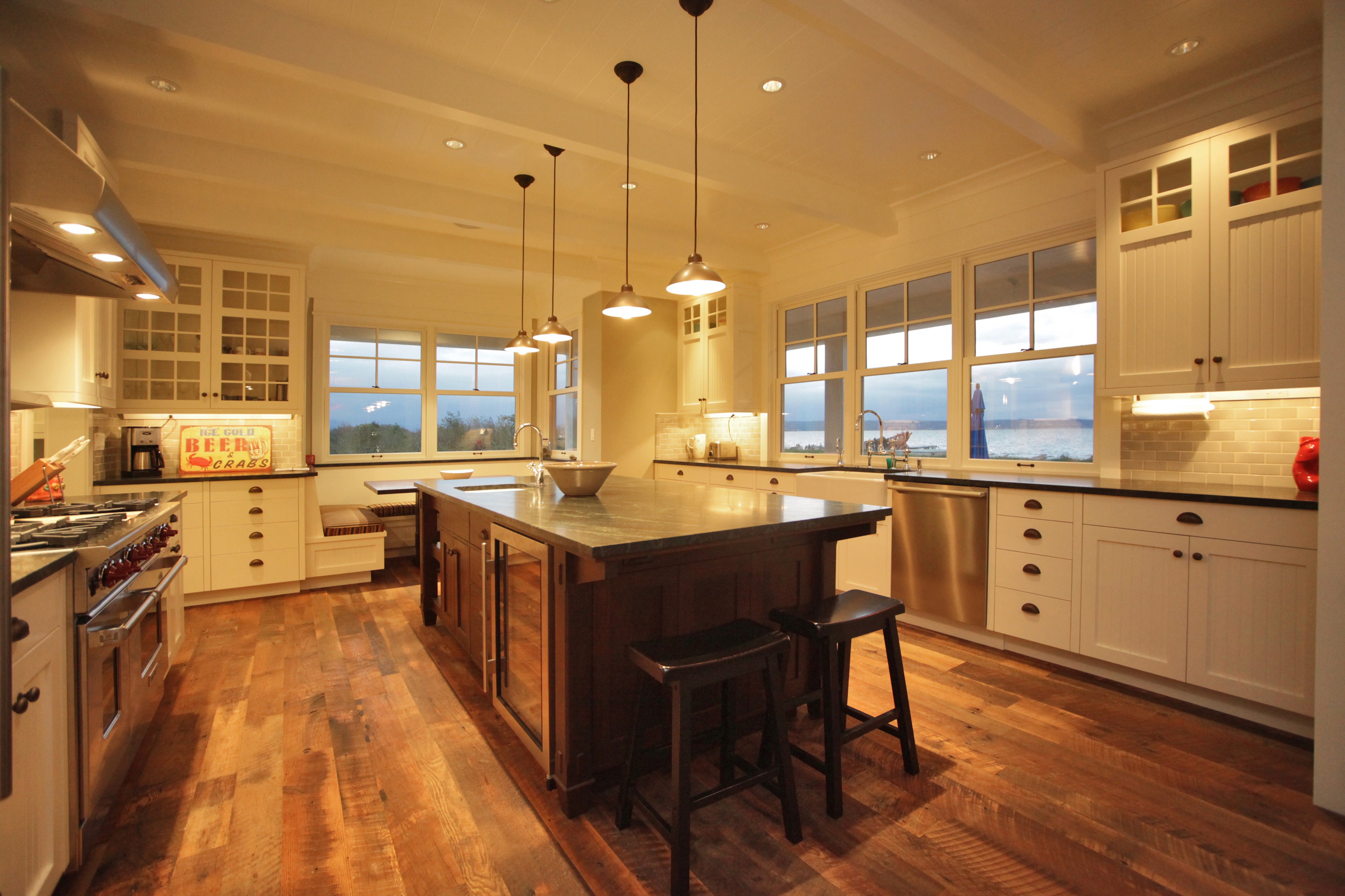 As in most cases, the Kitchen is the most popular room in the house. This Kitchen was designed for multiple cooks and helping hands. For the rest of the crew, the adjacent stone fireplace and beach side patio, allow them to be out of the way, but still close to the action.