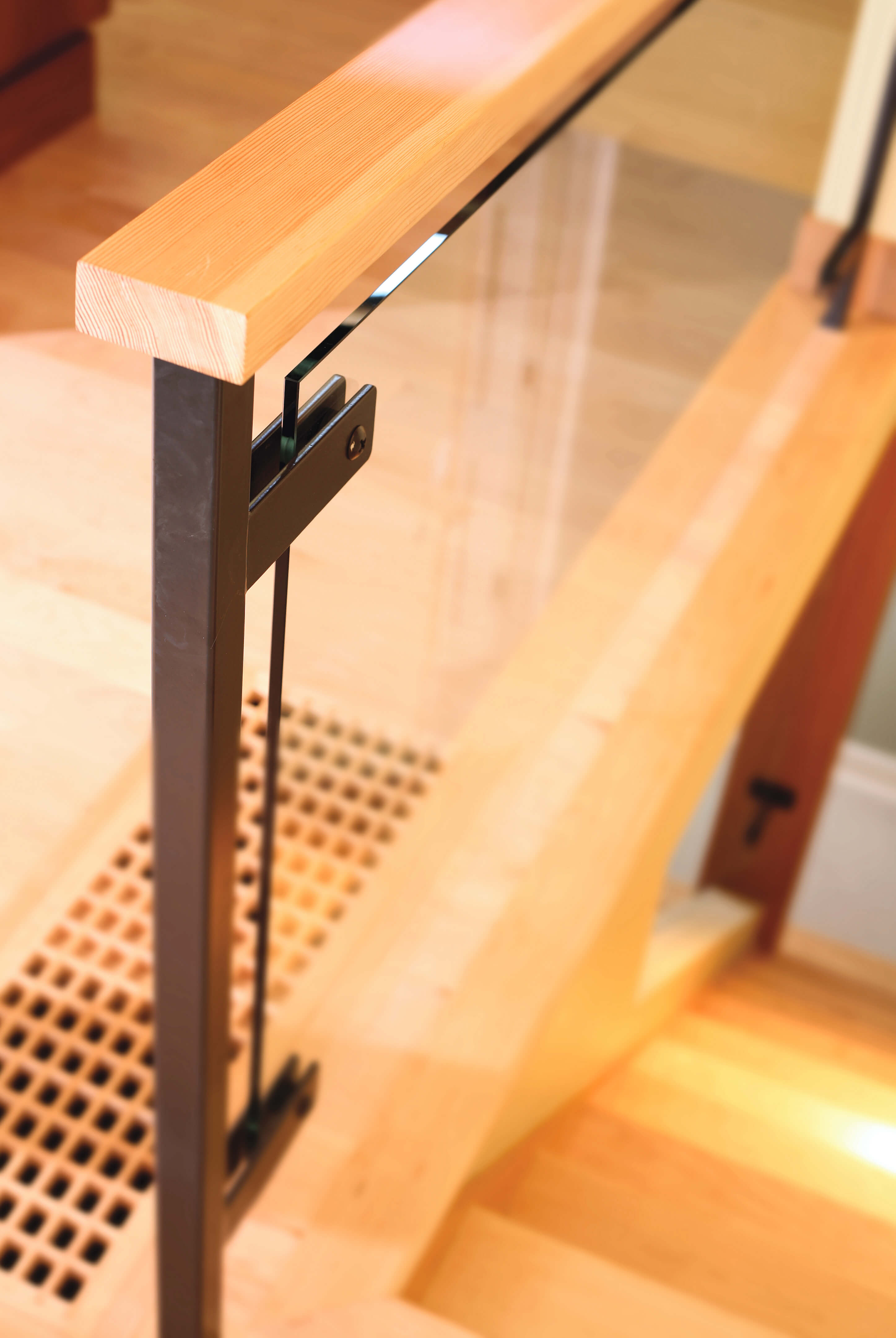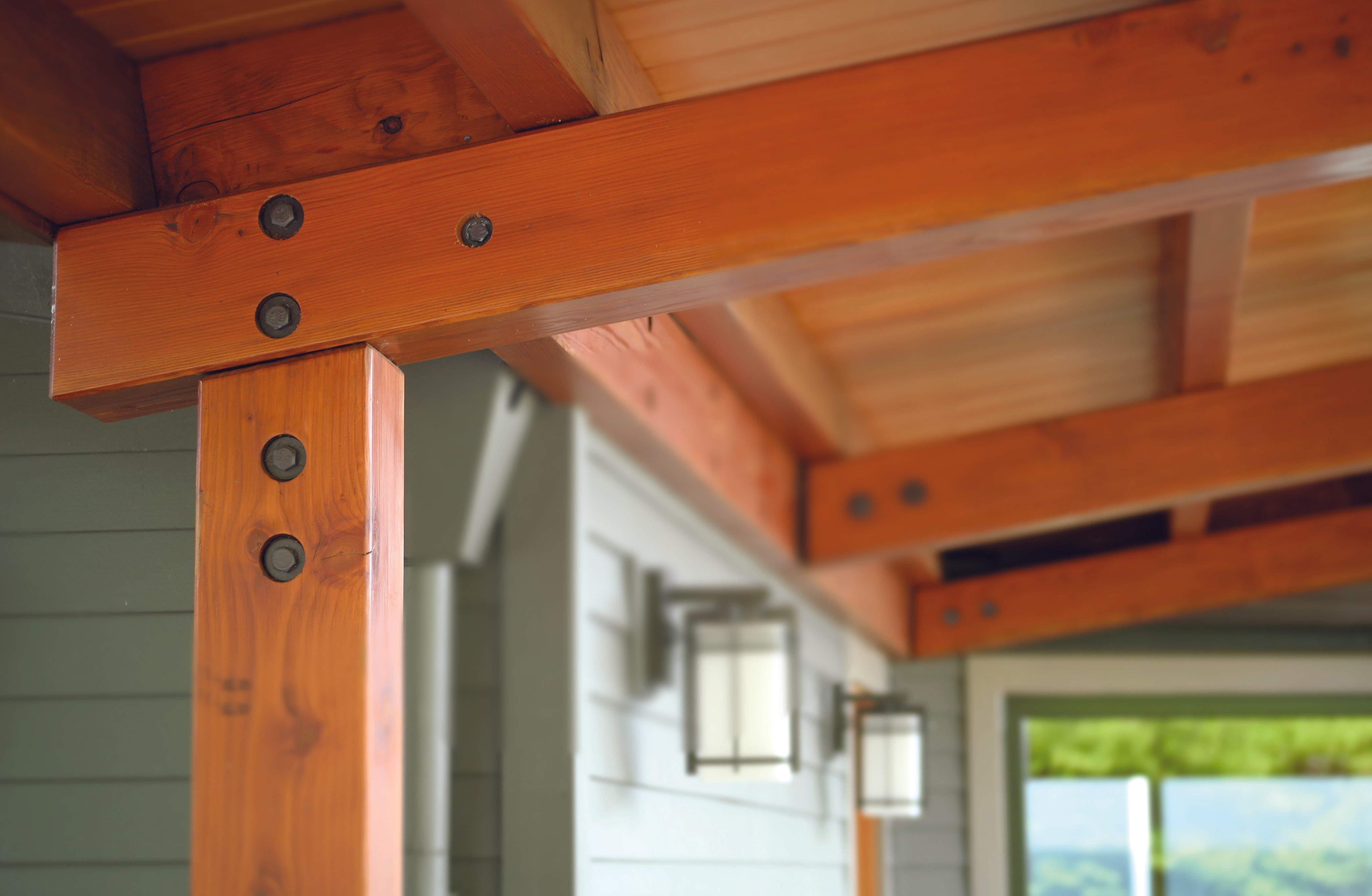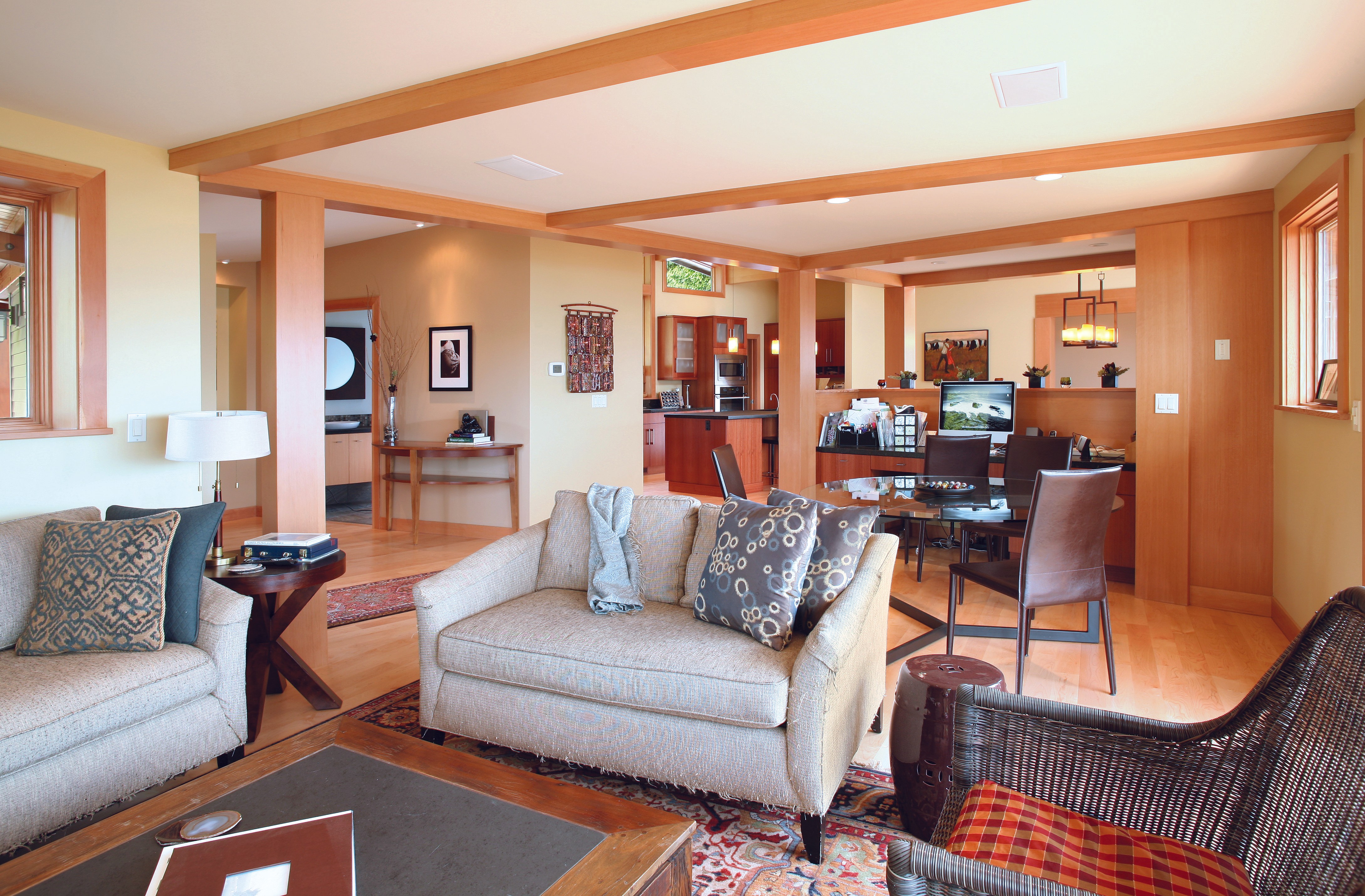 The existing dark exposed beams and trim were skinned in clear fir. Adding drywall areas to the ceiling helped lighten up the spaces
